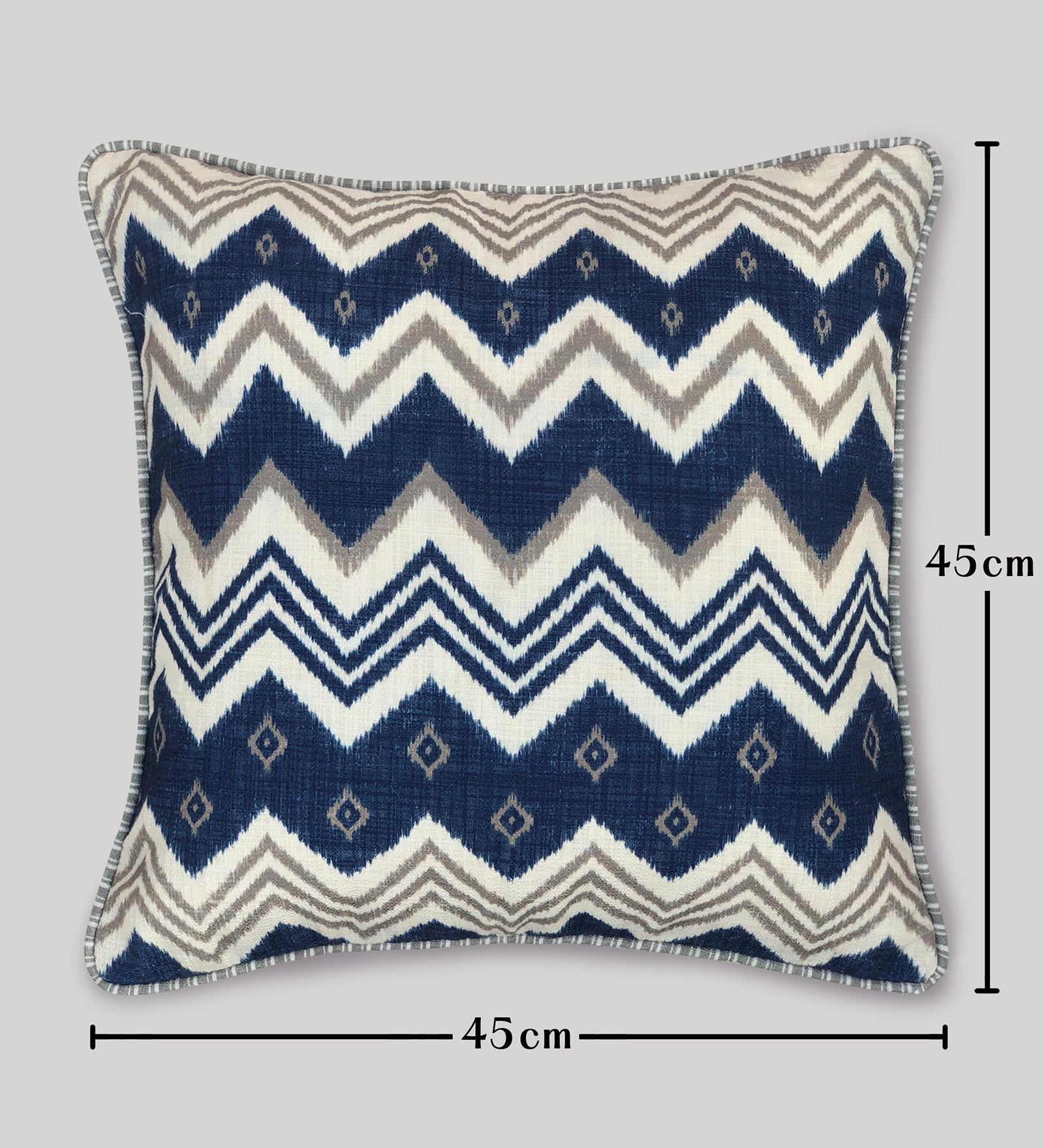 Introduce quiet sophistication to your living space with this finely crafted cushion cover, adorned in a timeless geometric Ikat-inspired pattern. Rendered in serene shades of navy, ivory, and soft taupe, the design brings a sense of rhythm and balance to your décor. Meticulously finished with tailored edges and a refined silhouette, this cushion serves as an elegant accent—effortlessly complementing both contemporary and classic interiors.